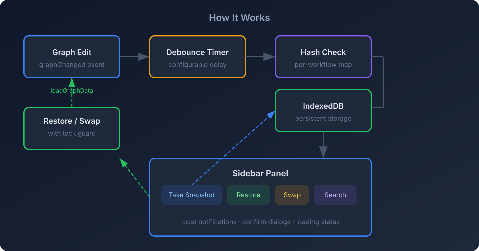 Auto-capture workflow snapshots with per-workflow hash map, promise-based restore lock, custom naming, search/filter, theme-aware CSS, toast notifications, and native confirm/prompt dialogs. Includes README with SVG/PNG assets, MIT license, and ComfyUI registry publish action. Co-Authored-By: Claude Opus 4.6 <noreply@anthropic.com>